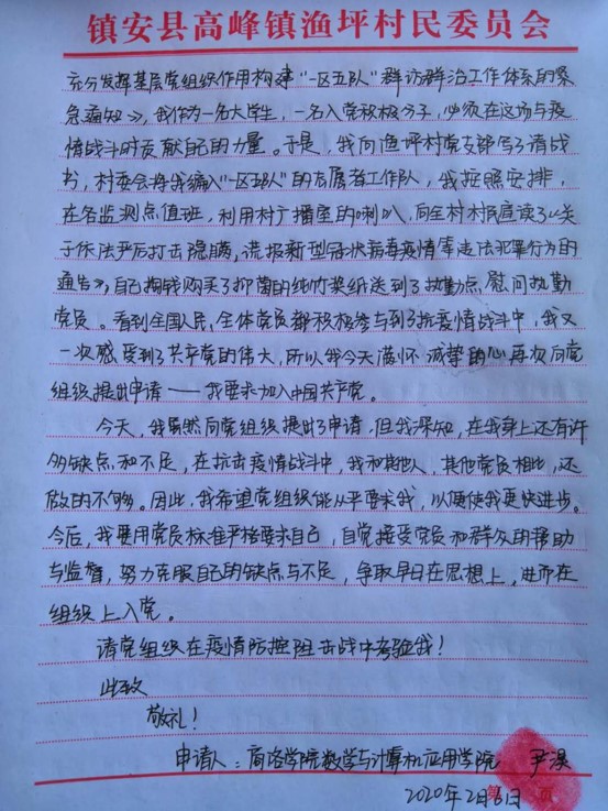 “請村支書給我安排工作任務”“請黨組織在疫情防控阻擊戰(zhàn)中考驗我”。這擲地有聲的話語,是商洛學院大三女學生尹淏2月3日和2月6日給高峰鎮(zhèn)漁坪村第一書記王新橋遞交的《請戰(zhàn)書》和《入黨申請書》里的兩句話。
