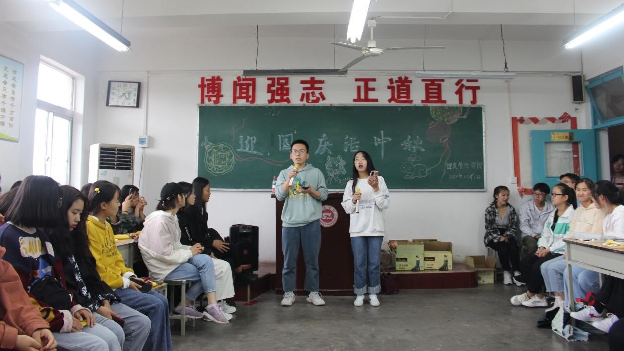 人文學(xué)院以“融入大集體 適應(yīng)新生活”為主題,組織全體學(xué)生干部與2020級在校新生開展了“迎雙節(jié)”聯(lián)歡會(huì)。會(huì)上,新老生代表進(jìn)行自我介紹、禮物互換、才藝表演,師生互動(dòng)開展了詩詞大比拼、成語接龍、數(shù)字炸彈小游戲,并共同觀看了抗擊新冠肺炎疫情專題片《在一起》。