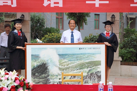 簽名贈(zèng)書儀式結(jié)束后,建工學(xué)院畢業(yè)生為了表達(dá)對母校的感謝之情,向母校贈(zèng)送了學(xué)生徐煥章所作的國畫《海納百川》作為紀(jì)念。