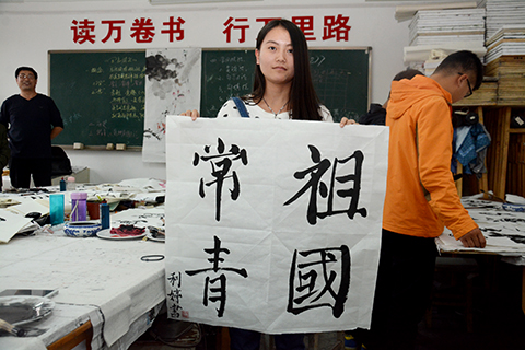 學生胡甜甜說道,書法是中國傳統(tǒng)文化的瑰寶,在祖國67華誕即將到來之際,用書法作品表達對祖國的愛,覺得很有意義,也深受教育。學生許佳妮說,作為當代大學生,我們要認真學習,練就報效祖國的本領,為實現(xiàn)中國夢做出自己的貢獻!祝祖國繁榮昌盛,美麗富強!
