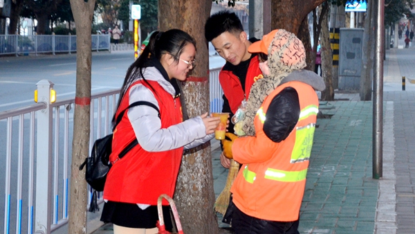 11月25日,我校團委組織青年志愿者協(xié)會、化學工程與現(xiàn)代材料學院40余名志愿者到商洛市中心廣場、萬事達廣場、黃沙橋沿路為環(huán)衛(wèi)工人送暖心早餐。