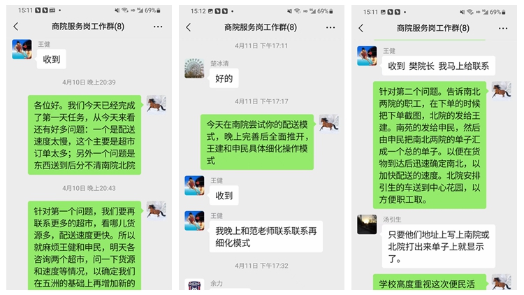 ——靈活調(diào)配,“疫”往無前。除保障校內(nèi)教職工必需的生活物資,便民服務(wù)隊還積極協(xié)助師生解決疫情期間的其他問題。4月12日,一位教師家中煤氣耗盡,便民服務(wù)隊多方聯(lián)絡(luò),及時為他送去新的煤氣罐,以解“燃眉之急”。在疫情防控應(yīng)急處置期間,學(xué)校前后進(jìn)行6輪全員核酸檢測。便民志愿服務(wù)隊隊員的工作時間大多集中在中午或下午,得知上午全員核酸檢測服務(wù)人手不足的情況,隊員們又主動加入核酸檢測志愿服務(wù)隊伍,為抗擊疫情多貢獻(xiàn)一份力量。