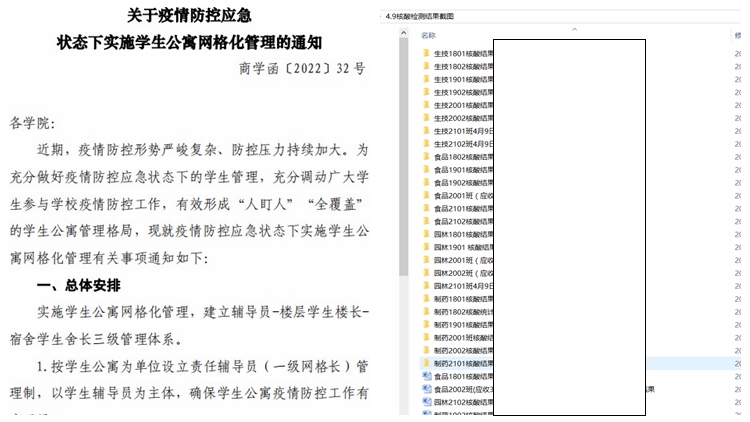 ——嚴密部署,科學管控。4月7日當天,學院迅速響應疫情防控摸排通知要求,框定時間地點,對57名教職工以及952名學生進行細致排查,沒有一名師生與陽性病例有過時空交集。學院疫情防控專班學生工作組、信息統(tǒng)計組隨即列出清單,第一時間統(tǒng)計出全院師生所在地及近期行程安排,掌握師生的當前狀態(tài),安排專人每日定時報送師生各項數(shù)據(jù),做到“人數(shù)清、狀態(tài)明”。在6次全員核酸檢測中,學院分布在兩校區(qū)的師生按照“采樣前逐人簽到”“采樣后收繳報告”的雙向聯(lián)動并行方式,切實做到應檢盡檢、不漏一人。