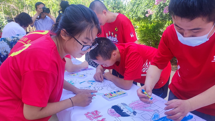 志愿者與智障人士一起開展了公雞下蛋、趕豬跑、益智套圈、兩人三足等趣味項目和彩繪心靈繪畫活動。通過活動,為智障人士搭建起溝通橋梁,提高他們對繪畫的認識和拓展,激發(fā)起他們創(chuàng)造性繪畫靈感,多途徑、多層面開發(fā)他們的潛能。