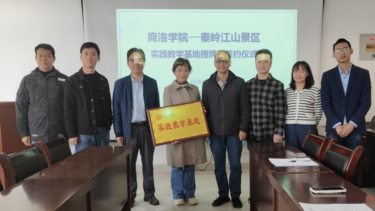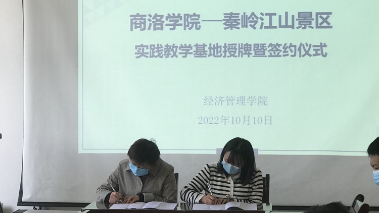 高擴昌代表學校向秦嶺江山景區(qū)授牌。經(jīng)濟管理學院副院長雷清和隋萍萍分別代表校企雙方簽署了《商洛學院校外實踐教學基地協(xié)議書》合作協(xié)議書。