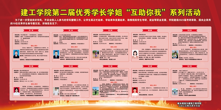 為扎實推進“學生活動富起來 學習任務重起來 教風學風嚴起來”,充分發(fā)揮優(yōu)秀畢業(yè)生傳幫帶作用,6月19日至27日,城鄉(xiāng)規(guī)劃與建筑工程學院開展第二屆優(yōu)秀學長學姐“互助你我”系列活動,遴選2023屆考研錄取、國央企錄用的優(yōu)秀畢業(yè)生為2020級全體學生、2021級部分學生做專題交流。