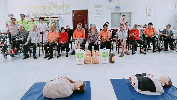 本次暑期社會實踐活動由急救知識講座、急救知識培訓、文體表演三部分組成。在急救知識講座中,志愿者們向工作人員及居住老人講解了急救定義、急救原則、急救意義及急救注意事項等相關知識。在急救知識培訓中,志愿者們向工作人員演示了心肺復蘇、傷口包扎法及海姆利急救法等救治手法。在最后的文體表演中,志愿者們?yōu)榫幼±先吮硌萘宋乃嚬?jié)目,為其帶去了歡樂。