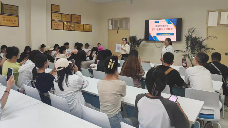 曹娜向新生代表介紹了圖書館館藏分布、借閱環(huán)境、微信公眾號(hào)、社團(tuán)、丹江校區(qū)分館等相關(guān)情況,重點(diǎn)講述了商洛紅色文化資料館、四庫(kù)全書以及商洛文化暨賈平凹研究中心等特色館藏資源,圖書借閱規(guī)則及線上借閱操作辦法等內(nèi)容。