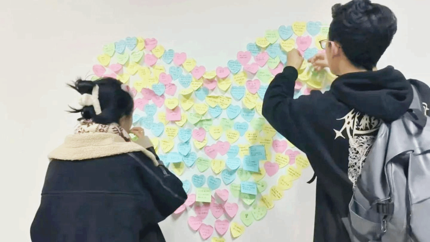 ——連心筑夢,舉辦“冬日有回音,研途有溫情”活動。為切實發(fā)揮朋輩心理互助的積極作用,低年級學生自發(fā)用手寫信、明信片、卡片、愛心留言墻等方式傳遞對考研學子的真摯祝福,“念念不忘,必有回響,以夢為馬,從容依舊,加油!”句句祝福為考研學子送上冬日里的溫情。