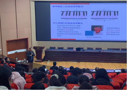 張勝貴教授以《斐波那契數(shù)列》為題,從數(shù)列的來源、與黃金分割的關系和應用等方面,完整、詳細地介紹了斐波那契數(shù)列。整場報告深入淺出,與會師生共同體驗斐波那契數(shù)列的美與價值。