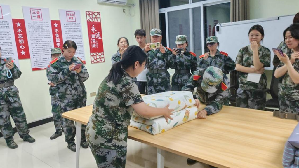 活動(dòng)期間,教官為同學(xué)們講解了《中國人民解放軍內(nèi)務(wù)條令》相關(guān)要求,圍繞“宿舍物品放置方法”向同學(xué)們進(jìn)行了耐心細(xì)致的講授。教官表示,內(nèi)務(wù)整理并不是簡單的打掃衛(wèi)生,它不僅是技能的學(xué)習(xí),更是一種態(tài)度的體現(xiàn),要時(shí)刻保持嚴(yán)謹(jǐn)與專注,從細(xì)節(jié)處塑造品格。活動(dòng)現(xiàn)場,教官們向同學(xué)們現(xiàn)場演示了被褥、枕頭整理和擺放,同學(xué)們通過認(rèn)真聽講,結(jié)合教官教授的方法紛紛“上手”整理自己帶來的被褥,并與自己的“作品”合影。這種寓教于樂的教學(xué)活動(dòng),豐富了軍事技能訓(xùn)練的內(nèi)容,進(jìn)一步提升了軍訓(xùn)工作的實(shí)效。