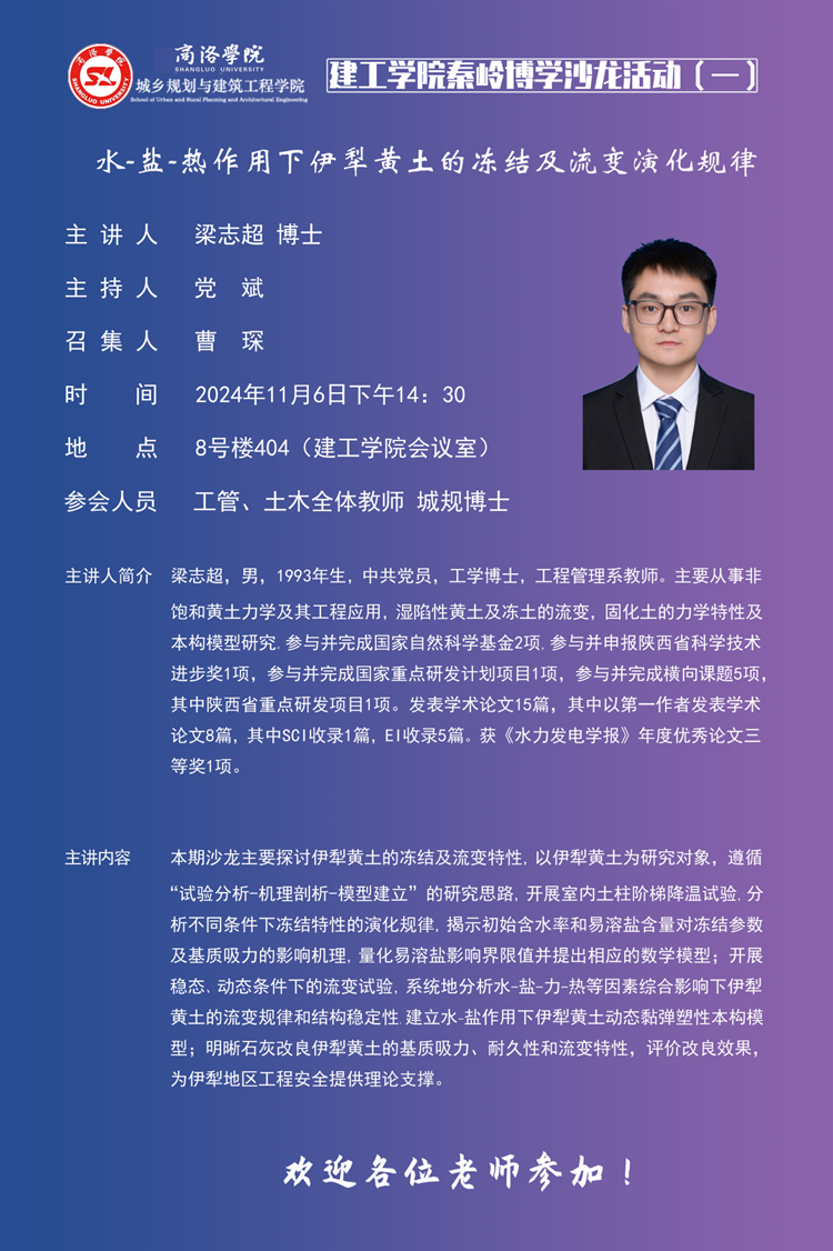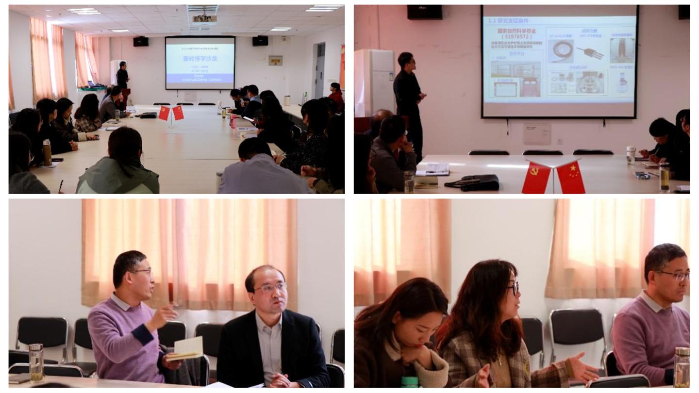 在首場(chǎng)活動(dòng)中工程管理系梁志超博士進(jìn)行了“水-鹽-熱作用下伊犁黃土的凍結(jié)及流變演化規(guī)律”的主題發(fā)言,梁志超分別從研究支撐條件、研究背景、研究成果及未來(lái)展望四個(gè)方面對(duì)水-鹽-熱作用下伊利黃土的凍結(jié)及流變演化規(guī)律進(jìn)行了分享。針對(duì)梁志超的研究?jī)?nèi)容,米文靜和劉國(guó)棟兩位博士分別進(jìn)行了交流發(fā)言,其余老師也積極交流、討論。同時(shí),老師們結(jié)合近期個(gè)人在閱讀文獻(xiàn)、撰寫(xiě)論文、投稿、申報(bào)項(xiàng)目、在研項(xiàng)目中存在的問(wèn)題和所思所想進(jìn)行交流。學(xué)術(shù)活動(dòng)氛圍非?;钴S、輕松。