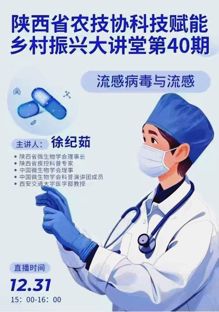 此次直播課是“陜西省農(nóng)技協(xié)科技賦能鄉(xiāng)村振興大講堂”的第40期,由陜西省科學(xué)技術(shù)協(xié)會(huì)主辦,陜西省微生物學(xué)會(huì)等3家單位承辦。直播課上,徐教授用通俗易懂的語(yǔ)言,生動(dòng)講解了流感病毒的病原生物學(xué)特點(diǎn)、類型、傳染性和抵抗力等健康知識(shí),以生活案例為切入點(diǎn)詳細(xì)闡釋了流感的臨床表現(xiàn)、病原、高發(fā)季節(jié)、傳播途徑、致病致死率、潛伏期、流行史等內(nèi)容,告訴大家發(fā)熱不適時(shí)如何自我判斷、如何正確用藥就醫(yī),引導(dǎo)大家通過(guò)及時(shí)接種疫苗、科學(xué)佩戴口罩、保障充足睡眠、遠(yuǎn)離密集場(chǎng)所、加強(qiáng)運(yùn)動(dòng)鍛煉等方式預(yù)防流感。