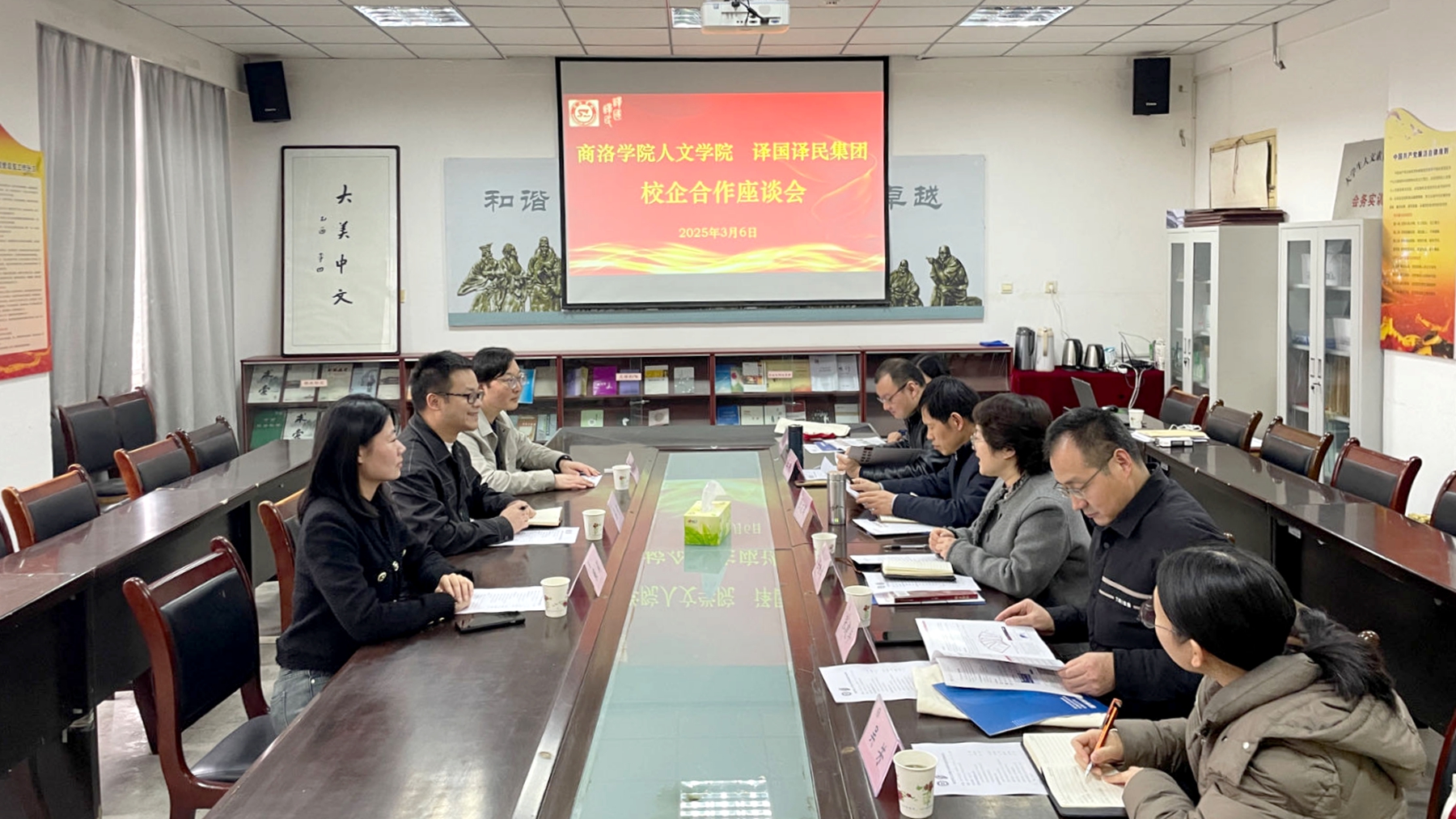 人文學院黨政主要領(lǐng)導和教師代表,譯國譯民集團西北公司總經(jīng)理吳強及相關(guān)工作人員,學校國內(nèi)合作與校友工作處相關(guān)負責人及工作人員參加會議。