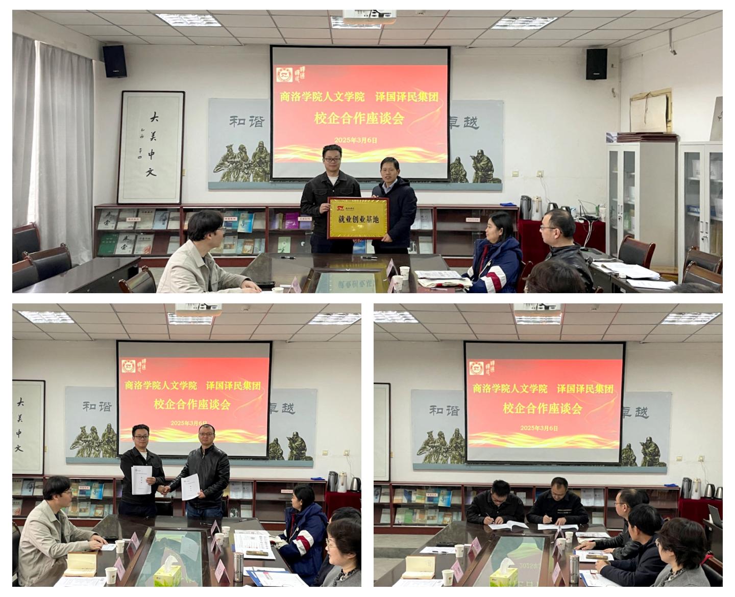 活動中,張文諾為該企業(yè)頒發(fā)就業(yè)創(chuàng)業(yè)基地牌匾,吳強代表企業(yè)接牌。人文學院黨委副書記王剛和吳強分別代表雙方簽訂了大學生就業(yè)創(chuàng)業(yè)基地建設(shè)協(xié)議,人文學院副院長張建軍和沈海濤分別代表雙方簽訂了實踐教育教學基地協(xié)議。