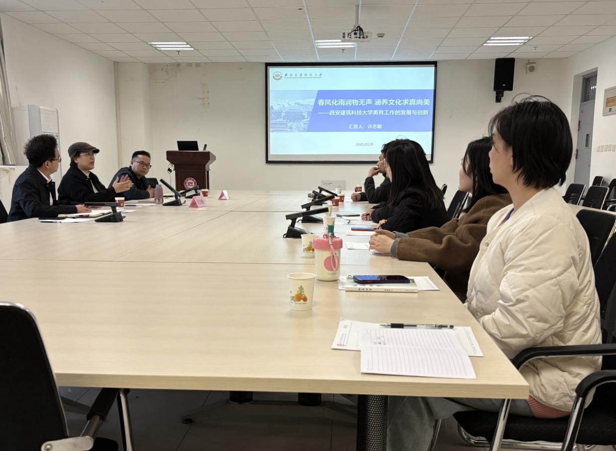 在美育講座中,陜西省高校美育教指委副主任兼秘書長、西安建筑科技大學(xué)文化藝術(shù)教育中心主任許志敏受邀為我校美育工作辦公室、公共藝術(shù)教育中心相關(guān)成員及藝術(shù)學(xué)院相關(guān)負(fù)責(zé)人作題為《春風(fēng)化雨潤物無聲、涵養(yǎng)文化求真尚美——西安建筑科技大學(xué)美育工作的發(fā)展與創(chuàng)新》的報告,她結(jié)合高校美育工作經(jīng)驗,就高校如何遵循美育特點面向全體學(xué)生開展美育工作分享了多元化創(chuàng)新實施路徑。許志敏提出要發(fā)掘非藝術(shù)專業(yè)學(xué)生的審美需求和藝術(shù)潛能,加強(qiáng)學(xué)生藝術(shù)社團(tuán)在美育活動中的引領(lǐng)作用。在互動交流環(huán)節(jié),與會教師就我校美育工作核心任務(wù)、美育師資隊伍建設(shè)、美育課程建設(shè)等問題與許志敏深入交流,現(xiàn)場氣氛熱烈。