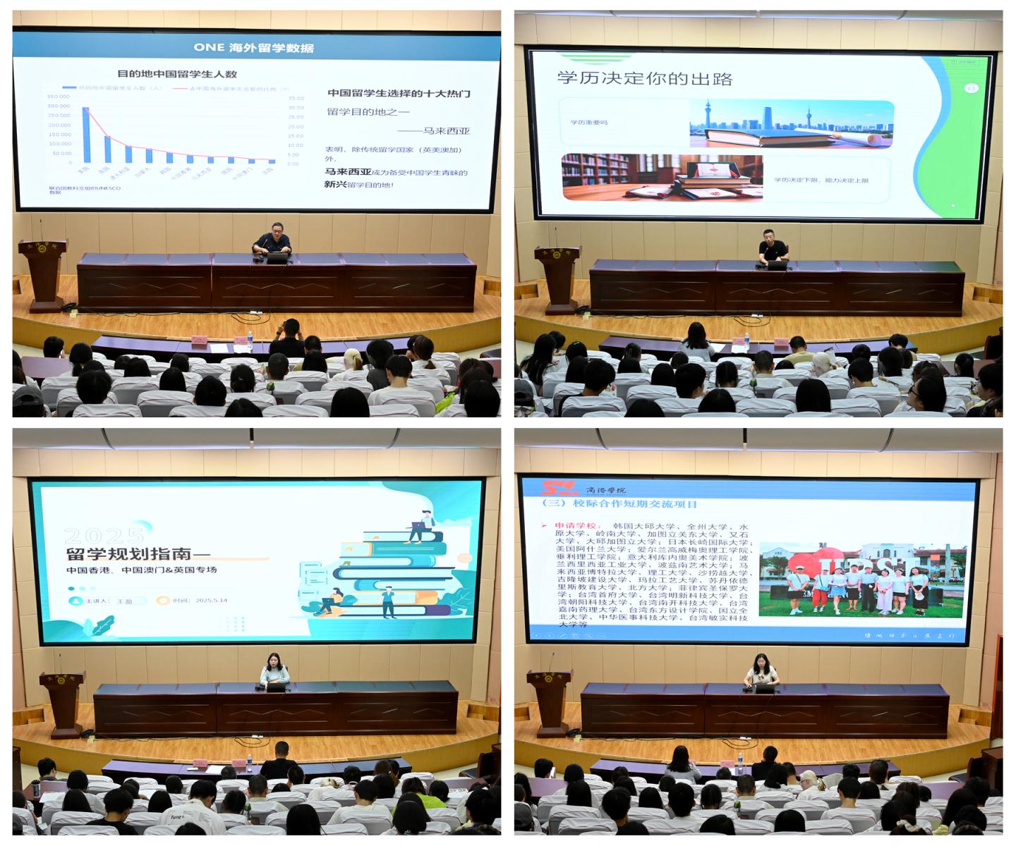 宣講會上,陜西省學(xué)生就業(yè)與留學(xué)服務(wù)中心姚運(yùn)章、于智丞、王盈三位老師分別就德國、馬來西亞、日本、韓國、英國等國家高校碩士項(xiàng)目優(yōu)勢特色、申請政策、留學(xué)生就業(yè)政策等進(jìn)行了詳細(xì)解讀。國際合作與交流處楊嬌詳細(xì)介紹了我校學(xué)生出國(境)交流學(xué)習(xí)項(xiàng)目途徑和獎勵資助政策。學(xué)生代表財(cái)務(wù)管理2231班張思揚(yáng)、財(cái)務(wù)管理2331班衛(wèi)一蘋分享了各自在馬來西亞博特拉大學(xué)交換學(xué)習(xí)和牛津大學(xué)訪學(xué)期間的見聞與收獲,以親身經(jīng)歷激發(fā)同學(xué)們對國際化學(xué)習(xí)的熱情。
