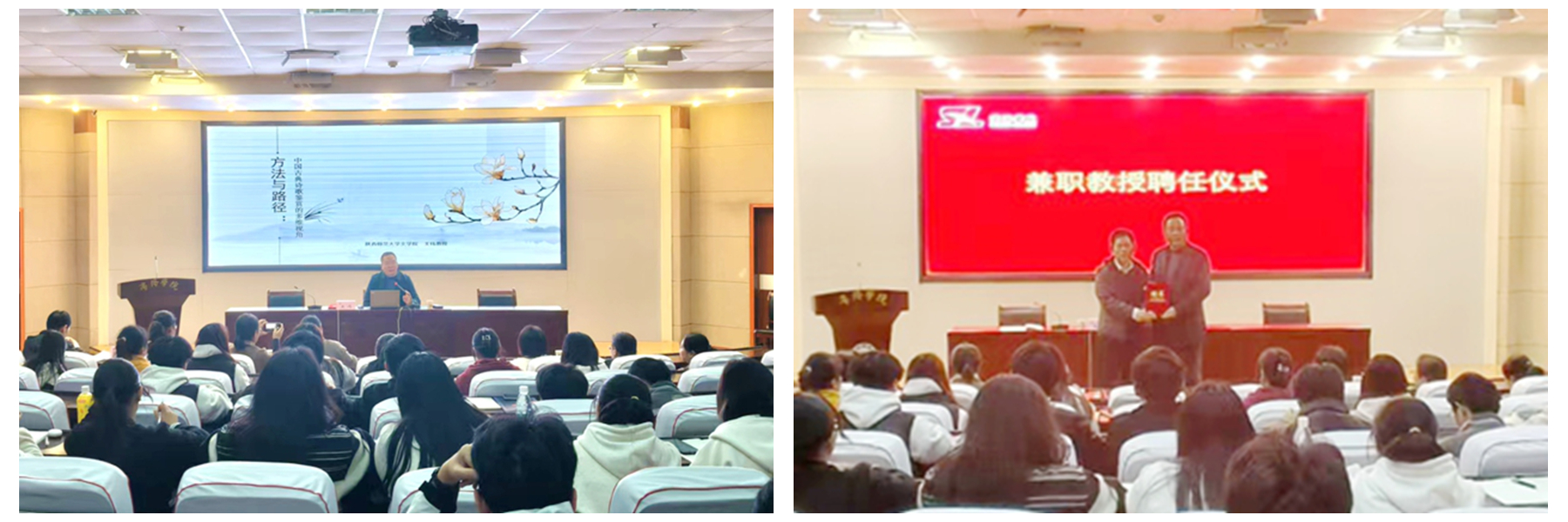 11月10日晚,陜西師范大學(xué)文學(xué)院教授、國(guó)家社科基金重大項(xiàng)目首席專家王偉應(yīng)邀來校,為人文學(xué)院師生作“中國(guó)古典詩歌鑒賞的多維視角”專題學(xué)術(shù)報(bào)告。人文學(xué)院院長(zhǎng)張文諾為王偉教授頒發(fā)兼職教授聘書。作為“商苑金秋學(xué)術(shù)季”的又一場(chǎng)學(xué)術(shù)盛宴,吸引了我校近200名師生現(xiàn)場(chǎng)聆聽報(bào)告。