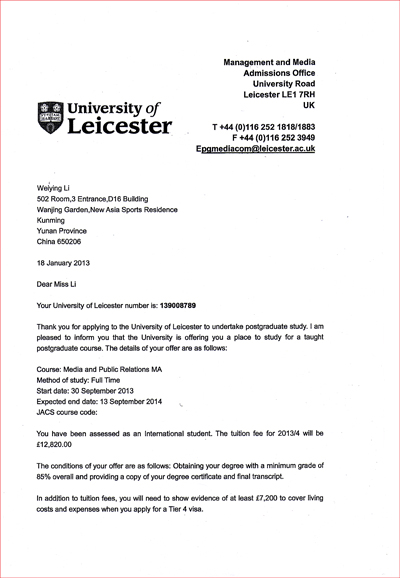近年來,我校本科畢業(yè)生報考研究生總數(shù)和上線人數(shù)連續(xù)實現(xiàn)翻倍增長,不斷刷新考研紀錄。除了國內(nèi)各重點大學外,今年在考取國外研究生方面,我校亦實現(xiàn)了零的突破。近日,外語系2009級英語本科專業(yè)的李瑋瑩同學成功考取了英國萊斯特大學研究生,被正式錄取為該校媒體和通信學院媒體與公共關(guān)系專業(yè)碩士研究生,成為我校歷史上首位考取國外研究生的學生